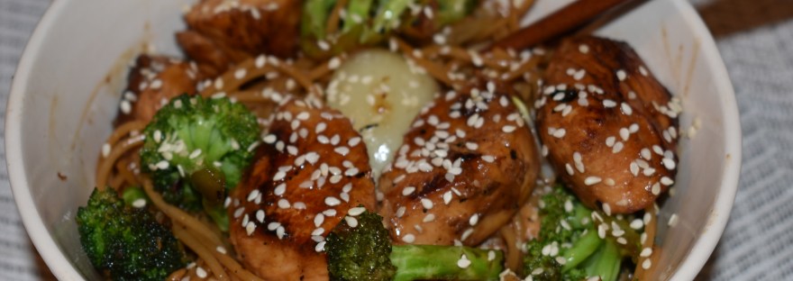 Chinese is always a favorite for take-out.  However, it is not always the healthiest option.  Of course, on those days when you want to indulge, go for it.  But on a day when you are craving some chicken and broccoli and lo mein but do not want to go overboard on fat and calories, try this recipe! It’s a variation from your traditional Chinese take-out, but in my opinion, it tastes even better!  Marinated chicken breast is stir-fried with broccoli, onions, whole wheat spaghetti, and some whole wheat spaghetti to create a healthy, delicious chicken and broccoli lo mein. Garnish it with some sesame seeds, and you have a super yummy work of art!