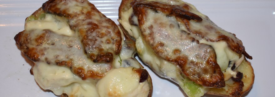 So here is my version of Chicken Skins. I use my chicken salad recipe which has celery, craisins, and slivered almonds, and the combination of the chicken salad with the warm potato, the melted cheese, and the crispy bacon…just incredible! You will love it. 🙂